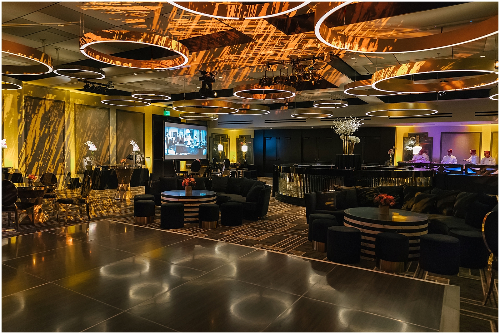 Revelry Event Designs and Flower Blush transformed this room into an elegant/ retro space with the decor and lighting. Lighting is SOOO important. It sets the vibe for the party and for the photos. Try to imagine this space without lighting. Luckily, The Garland thought of the ceiling when they redesigned the ballroom. The rings of light fit into a modern or retro vibe and add ambience to the space.